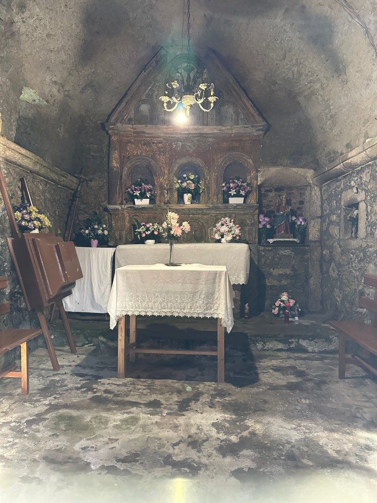 Immer bergauf, aber nicht so steil, wie zum Anfang, da sind wir doch erleichtert. An der Kapelle in Biduido, sie ist natürlich verschlossen, kann ich durch das Fenster in der Tür den Innenraum einsehen.
