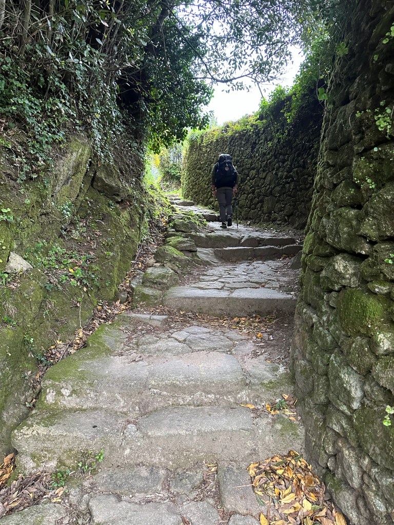 Raus aus dem Ort geht es durch enge Pfade, gesäumt von aufgetürmten Trockenmauern. Der erste Anstieg des Tages.