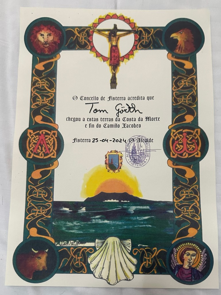 In der öffentlichen Albuerge holen wir uns den letzten Stempel und die „Fisterra“ die Urkunde für den Weg hierher.