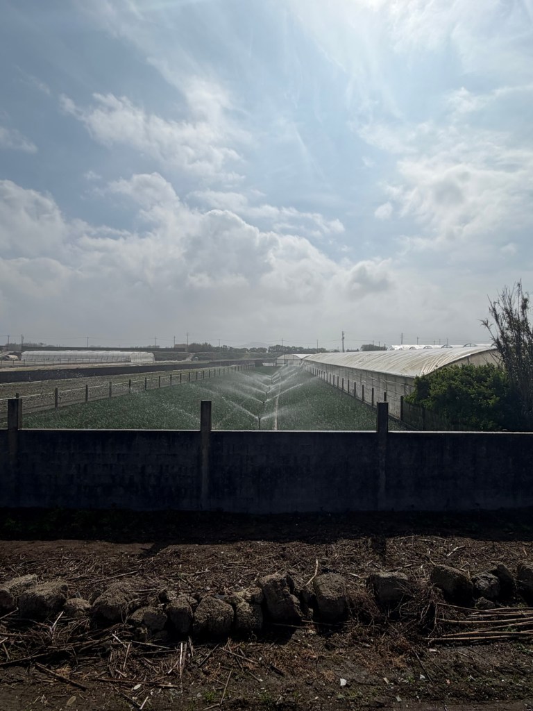 Durch ein Gebiet mit Gewächshäusern und Gärtnereien. Probleme mit Wasser haben sie wohl nicht, volle Kanne beregnen in der Mittagssonne.