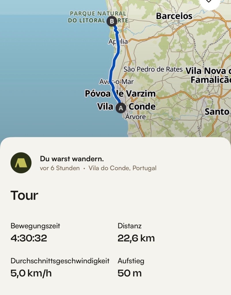 In Póvoa de Varzim, schon nach 2 km stopp, die Jacke muss ich ausziehen, es weht zwar ein bisschen vom Meer her, aber es ist trotzdem schon sehr angenehm.