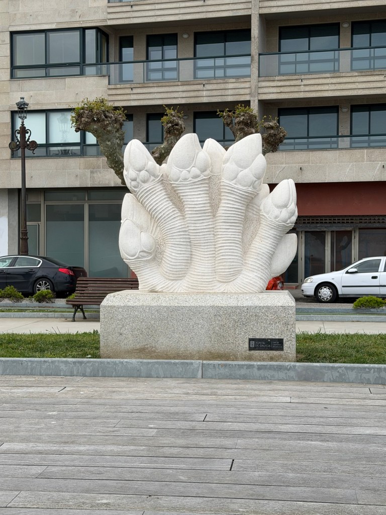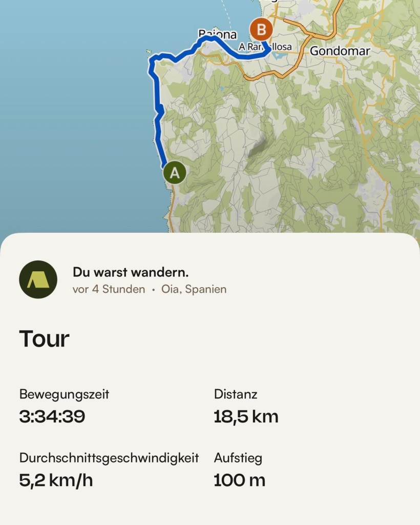 Das ist nicht gut, aber was hilft es. Also nochmals 3 km bis nach Baiona. Aber da ist nicht nur ein Café! 3 km Asphalt bis zur Stadt, nun wird’s langsam Zeit.