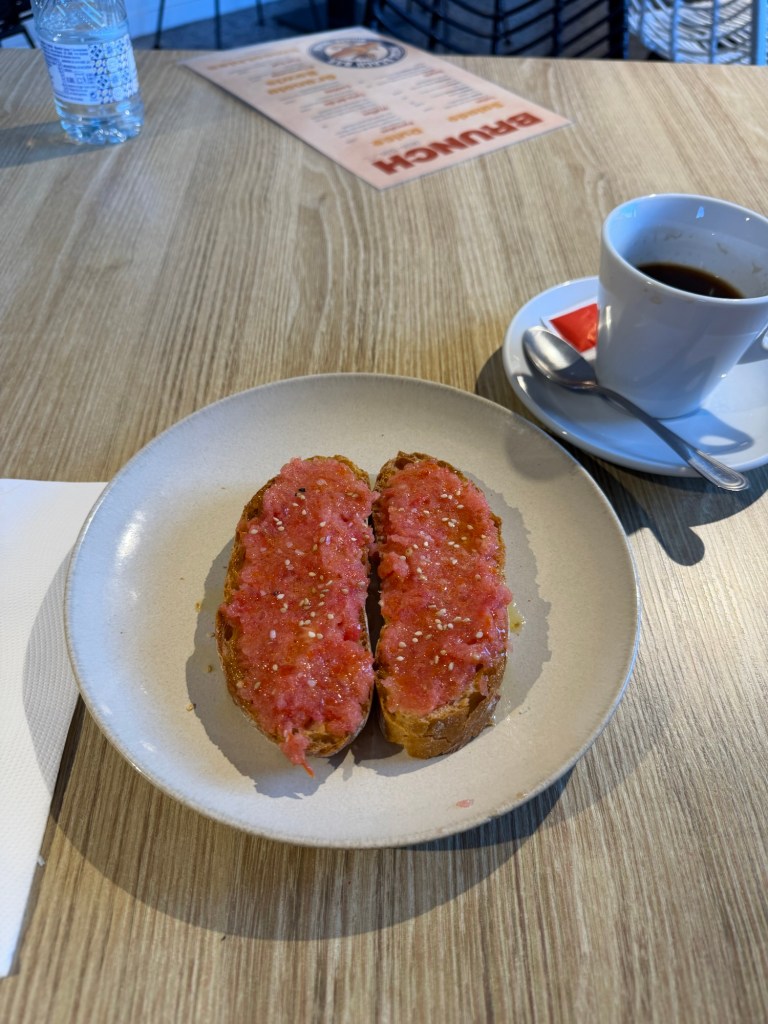 Das Café am Ende der Bucht hat das richtige Frühstück für mich, Tostarda mit „gehäckselter“ Tomate, Olivenöl und Sesam.