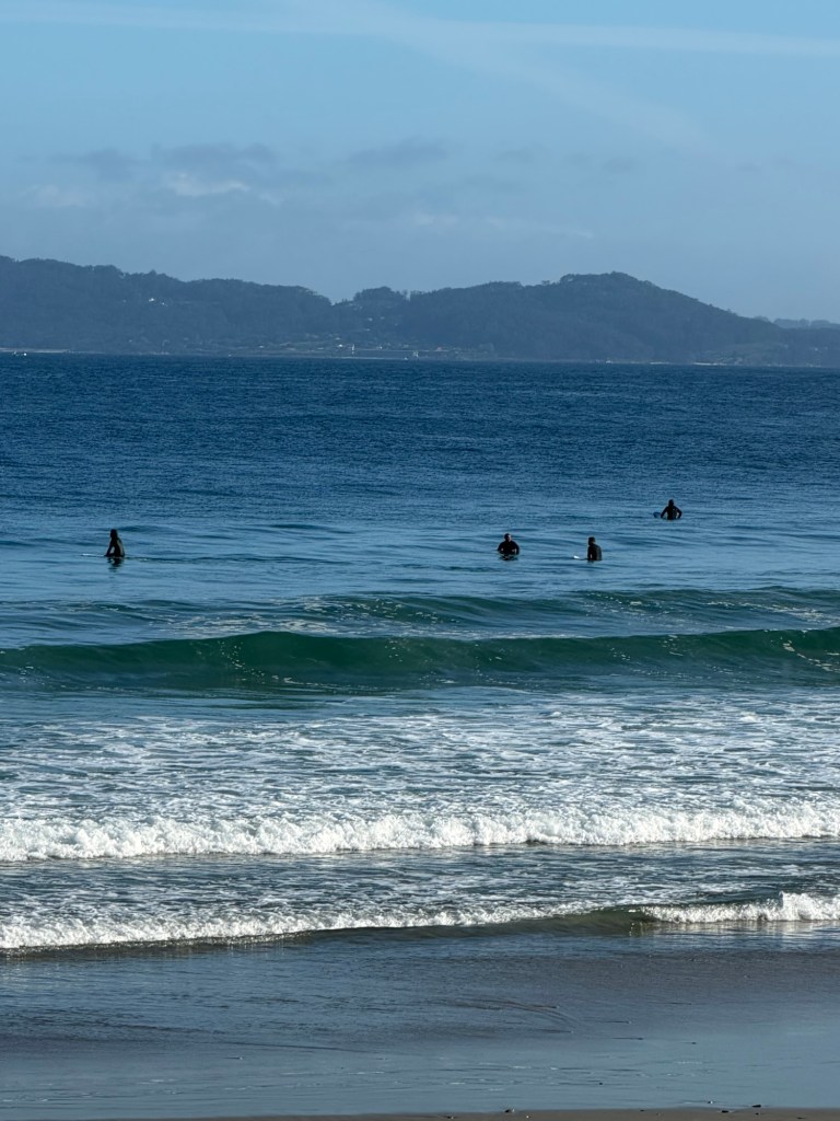 Die Surfer sind auch schon im Wasser und reiten auf ein paar schönen Brechern zum Strand.