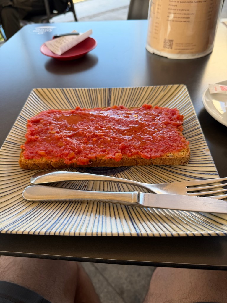 Die erste Raststätte nach 5 km ist noch nicht überfüllt, ich hab mir Tostarda mit Tomate und Olivenöl bestellt.